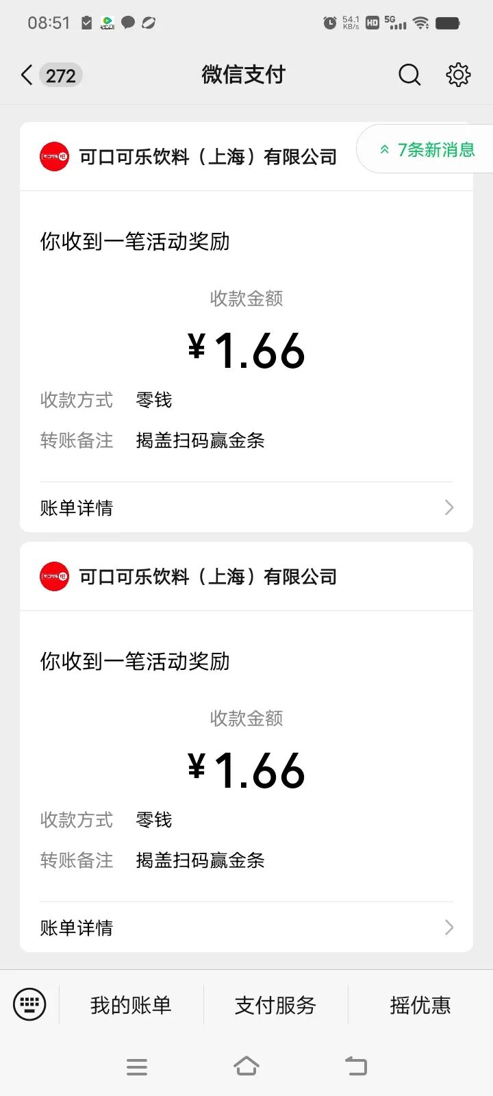 大家都喝过可乐,饮料吧,商家为了推广商品,会在瓶盖内测印上二维码,扫码二维码回得到一定的金额,我昨天扫了5个瓶盖中了3快