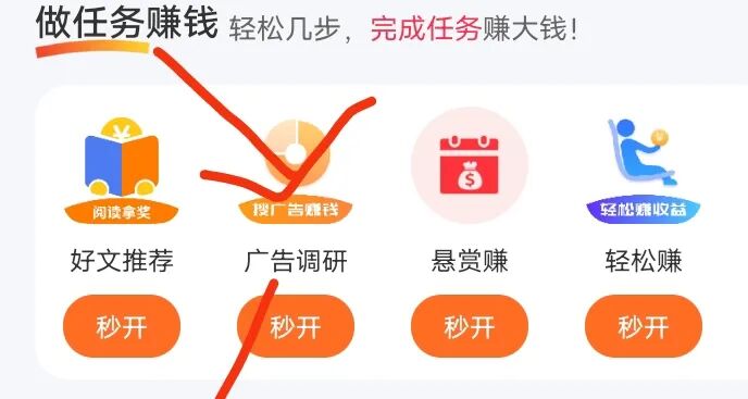 再就是第二种玩法广告调研,这个需要抢名额,单价也比较高,每天的晚上12点发放名额500个,我连续抢了2天,都可以抢到,点击发现,向下滑动有个做任务赚钱,广告调研,点击进去就可以